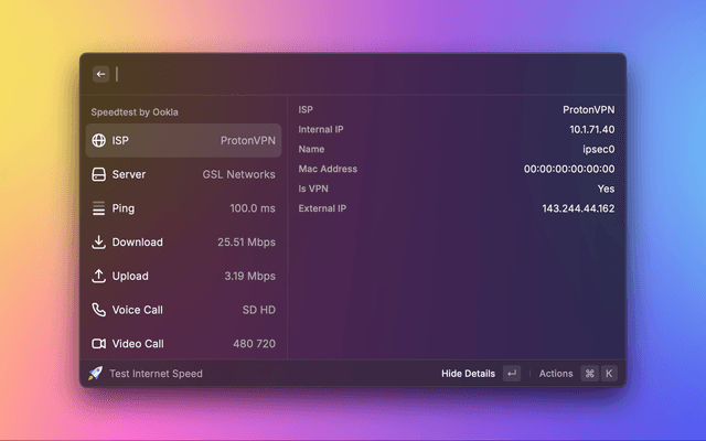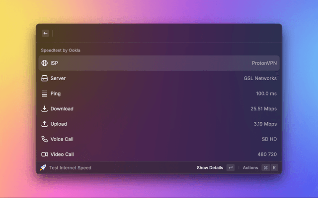 Unlock the true potential of your internet connection with Raycast's Speedtest extension. Powered by speedtest.net 🚀, this tool gives you the lowdown on your network's performance in seconds.